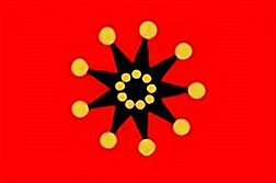 九角表示夏禹九州,十八星代表长城以南十八行省,大圆心代表中央政府,十八星黄色代表黄帝子孙。