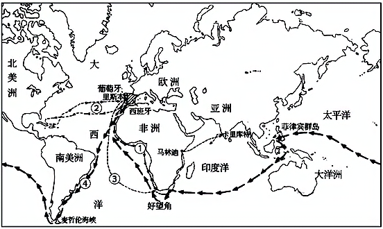 (2)材料二为“新航路开辟示意图”,图中①②③④所示是航海家开辟的四条新航路。其中,哥伦布与麦哲伦船队开辟的新航路分别是哪一条?(6分) 材料三 在文艺复兴人文主义精神的鼓舞下,航海家们乐观进取和积极冒险的精神,驱使他们远渡重洋,开辟新航路,发现新大陆,寻找黄金,追求现实生活中的幸福。因此,地理大发现是……文艺复兴运动的副产品,是人文主义精神的外在表现。