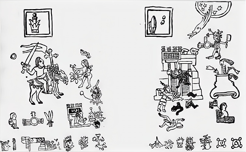 除了少许的文字记载,阿兹特克人的文化大多通过壁画、雕塑和其他器物保存下来。那些重要的历史事件往往由他们的征服者记载,不过下图确实很罕见的出自阿兹特克人之手。这幅作品大约创作于1519—1522年之间,注意,阿兹特克人给科尔特斯的似乎是个花冠,征服者科尔特斯挥舞着宝剑。此图现存于罗马梵蒂冈图书馆。
