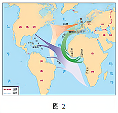 (1)根据材料一,分析美洲当地劳动力锐减的主要原因。并根据图2及所学知识指出,以贩卖黑奴为中心的贸易被称为什么?(4分) 材料二