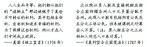 (2)根据材料二及所学知识,说明1787年美国宪法并未体现出“人人生而平等”的理由。(2分) 材料三