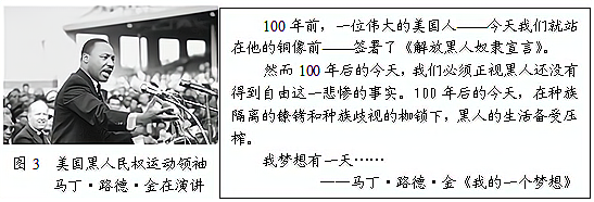 (3)根据材料三及所学知识指出,马丁·路德·金演讲中的“一位伟大的美国人”是谁?马丁·路德·金的梦想是什么?(4分) 材料四 习近平同志指出:“不同民族、不同文明多姿多彩,各有千秋,没有优劣之分,只有特色之别。”“今天,人类生活在不同文化、种族、宗教和不同社会制度所组成的世界里,各国人民形成了你中有我、我中有你的命运共同体。”
