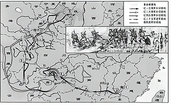 下面《中国工农红军长征路线示意图》中,序号①和⑤的地名分别是