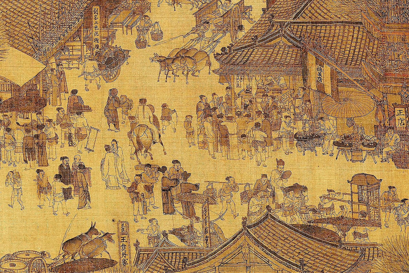图上的这些场景描绘了哪一朝代都城的社会风貌?(3分)这一朝代出现的世界上最早的纸币叫什么?(3分)