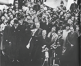 自慕尼黑返回伦敦的张伯伦,在机场上挥舞着 捷克边境小镇海布的居民流着