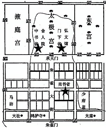 中书省、门下省同处北面的宫城,与尚书省隔着宫墙南北分开。门下省诏敕行达尚书省,需先经其长官审阅,若发现差错,可以不奉诏,甚至封还诏书,但一般都是奉敕力行。