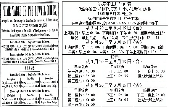 1853年美国一家工厂制订的工人每日时刻表及译文(局部)