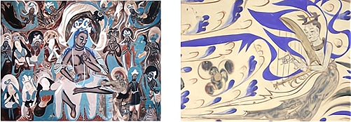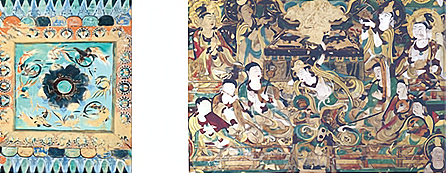 图3 隋代《献花伎乐飞天》 图4 唐代《观无量寿经变反弹琵琶乐舞》