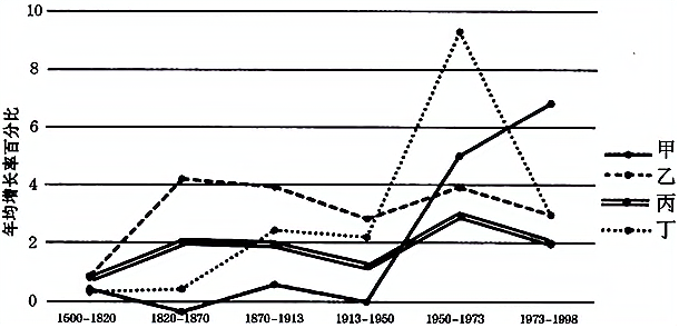 1500—1998年中国、日本、美国和英国的GDP年均增长率趋势图