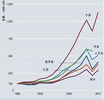 图1 最大的几个发展中国家从1996年到2010年制造业出口情况