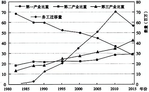 1980—2015年中国务工迁移量与产业(就业)结构比重变化示意图