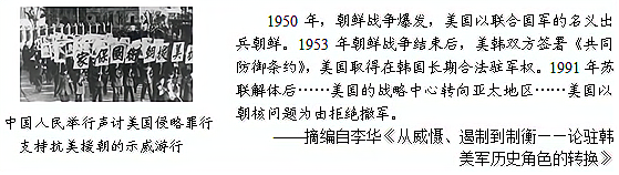 (3)在抗美援朝保家卫国的战争中,中国人民志愿军发扬了怎样的精神?(1分)依据材料三,结合所学知识,概括20世纪50年代以来美国在韩国驻军的原因。(2分) 【重返亚太】 材料四