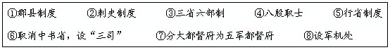 ——以上两则材料均摘编自人教版七年级《中国历史》下册 (1)从材料一的表中,找出下列各朝代中央对地方管理的制度或措施,将序号填入表格,(4分)