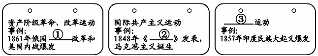 根据材料一、二并结合所学知识,也答下列问题: (1)17~19世纪,世界主要资本主义国家走上发展资本主义道路的方式有哪几种?(4分) (2)指出13~19世纪西方资本主义发展史上先后出现过的三种生产组织形式。(6分) (3)19世纪中期,随者工业革命的完成,世界出现了三股进步潮流。请将下列知识卡片补充完格。(6分)