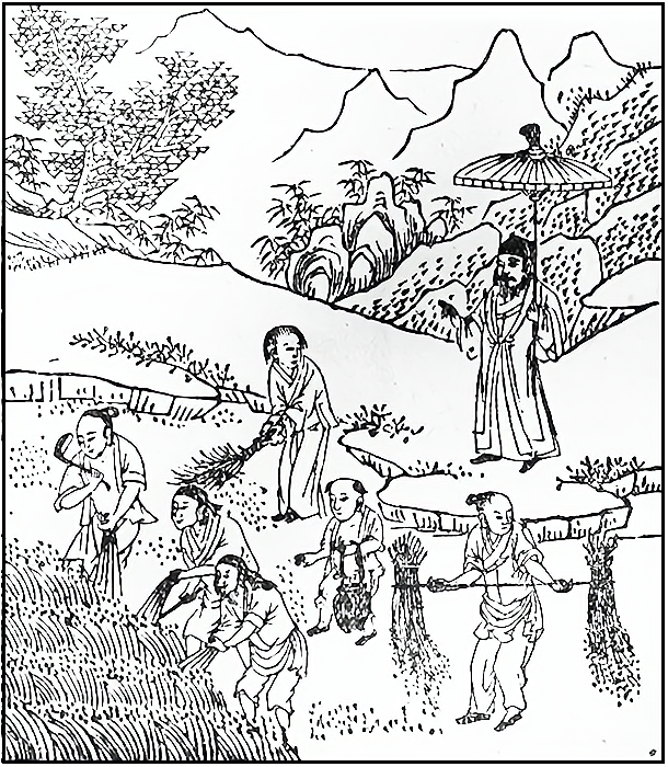 下图为明代典籍中所载的《收割图》。此图可以用来说明当时(  )