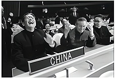 左图照片为《乔的笑》。有西方记者形容乔冠华的这一笑, “震碎了联合国议事大厅的玻璃”。 当时,一名外国记者问中国代表团团长乔冠华; 中国恢复联合国席位,你有何感受? 他没有回答,而是坐到了会场中放置有CHINA铭牌的座位上仰首大笑起来。