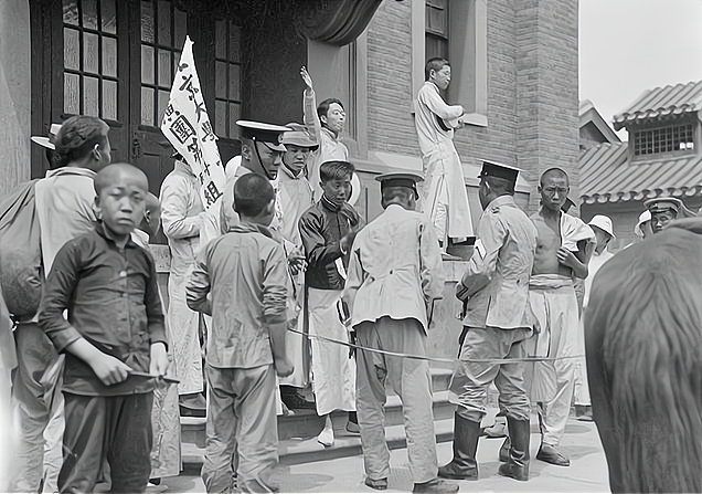 街头演讲的北大学生与警察进行辩论