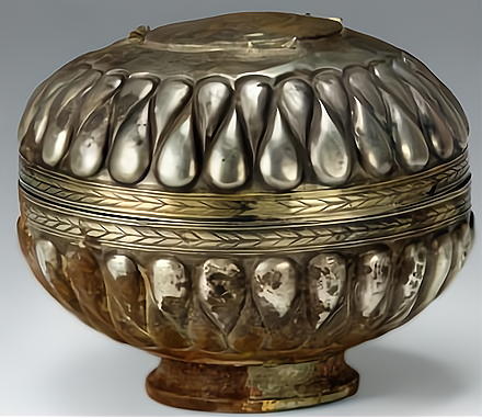 西汉鎏金青铜座银盒:用银片锤出器形和凸起的裂瓣纹样,与波斯及地中海沿岸古代国家金银器工艺和纹样极为接近