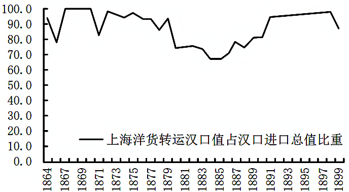 上海洋货外贸埠际转运占汉口进口比重图(1864—1899)