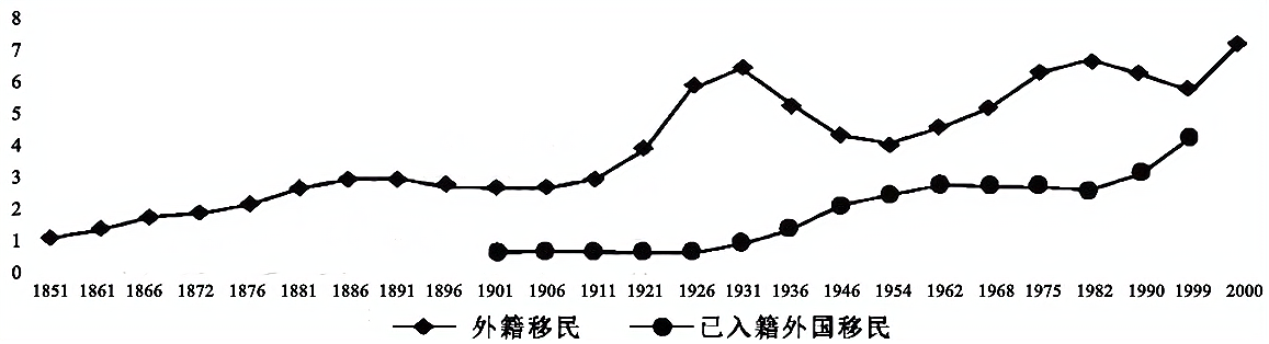 移民在法国总人口中所占百分比(1851—2000年)
