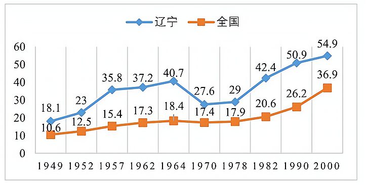 1949年—2000年辽宁城市化率与全国比较图