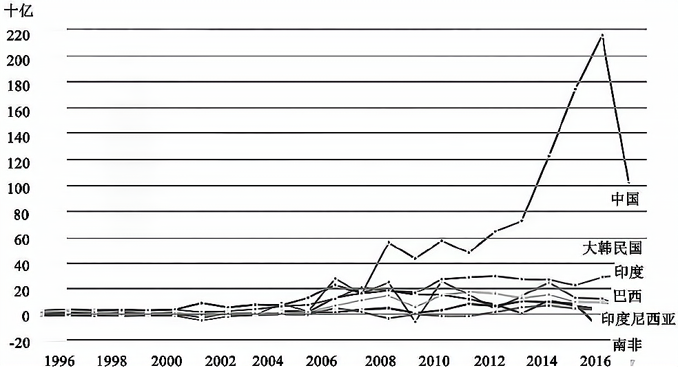 2000—2016年部分新兴市场国家对外投资(outward FDI,current US$)