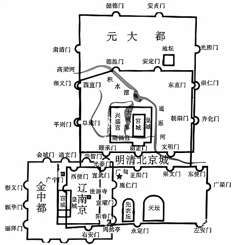 1153年,海陵王完颜亮迁都燕京,定名中都大兴府,这是北京历史上第一次正式成为王朝首都。时人记载中都“宫阙壮丽” “工巧无遗力”。中都仿照北宋汴京,采用回字形相套,宫城位置居中,城内建有礼制建筑,如郊天坛、雨师坛等。