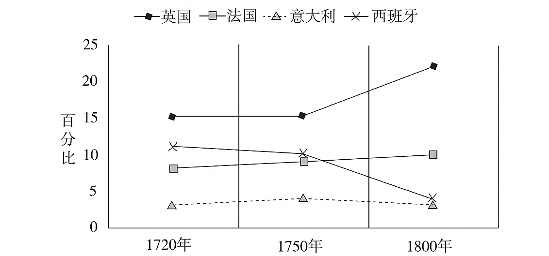 1720—1800年部分国家和地区对外贸易颔占世界总额比例折线图