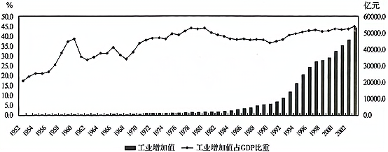 图5 1952~2003年我国工业增加值及其占GDP比重的年际变化趋势图