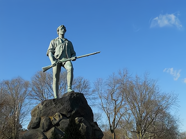 位于来克星顿的一座纪念碑,碑座上是一尊手握步枪,头戴草帽的民兵铜像