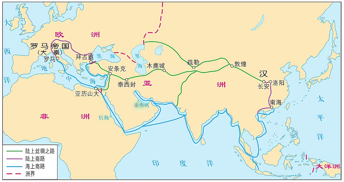 汉朝与罗马帝国交往的主要路线示意图 古典时代(公元前500—公元500年)之前,远距离贸易存在很大的风险。在古典时代,两方面的发展降低了旅行的风险,刺激了远距离贸易。首先,统治者出于军事和管理国家的目的,大力投资修建道路和桥梁,客观上促进了国内贸易的发展。其次,古典社会建立起来的庞大帝国往往彼此相连。当这些帝国彼此之间没有直接的对抗和冲突时,整个欧亚大陆和北非的广大地区就会出现一派和平的气息。远距离商贸的成本降低了,商品经营的规模急剧扩大。