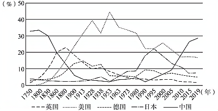 图4 主要国家制造业产量的相对份额(1750—2019)