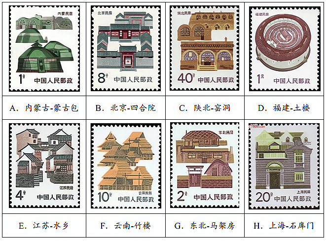 (1)下列邮票选自中国人民邮政出品的中国民居系列,请根据要求将它们做大致的分类。(填写字母,16分)