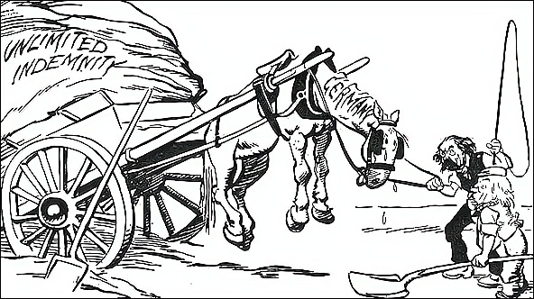 此画是新西兰画家大卫·洛于1921年创作的。画中的马代表德国,马车前,英国首相劳合·乔治对手持马鞭的法国总理白里安说:“也许让马蹄着地它会跑得更快一些。”