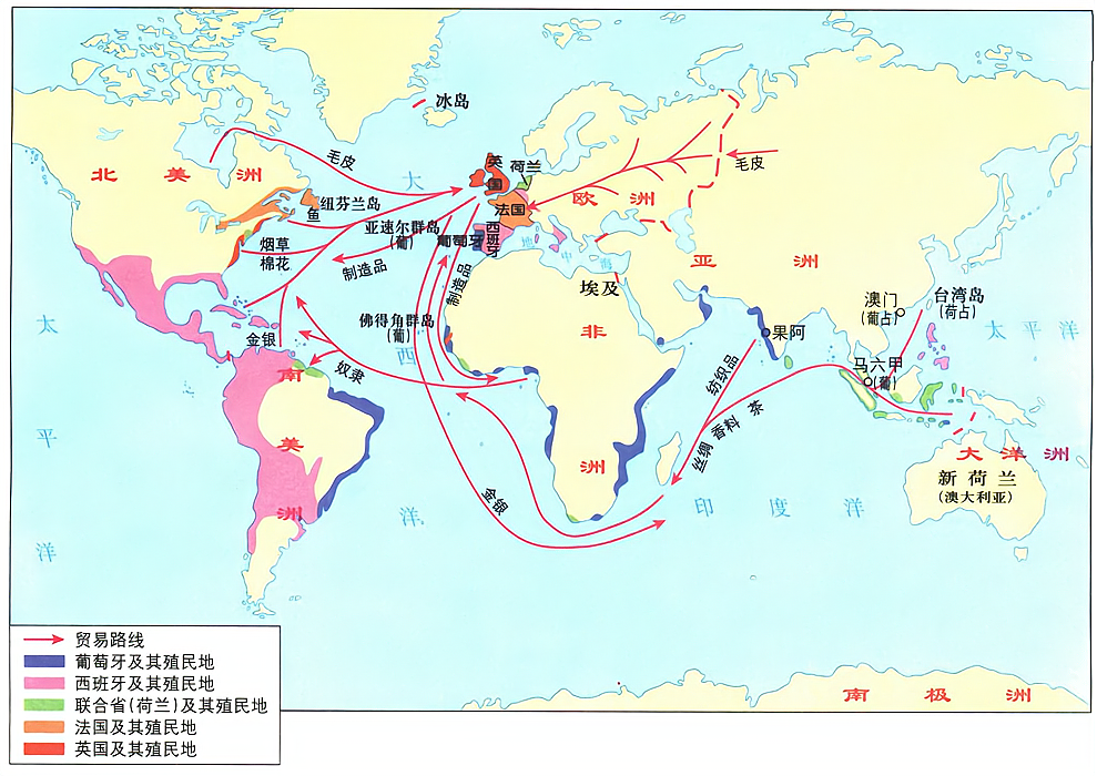 下面是15世纪末至17世纪上半期世界形势与贸易图。