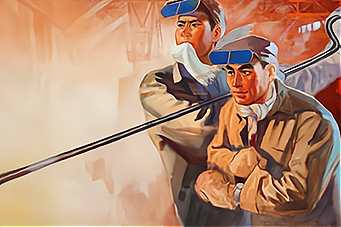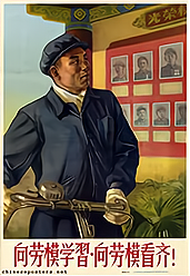 (《向劳模学习,向劳模看齐!》,翁逸之,1955年)
