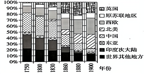 (2)阅读材料二,以1880年为界概括1750—1900年英国在世界制造业中占比变化的趋势,并说明其1880年之前的趋势形成的内在原因。