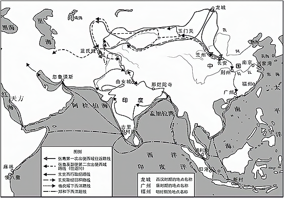 图1 汉、唐、明时期的对外交流示意图