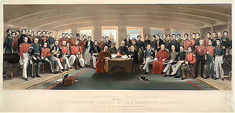 图:《南京条约》的签订与钤印 《<南京条约>的签订与钤印》描绘了签约场景和出席仪式的中英官员,几乎是中国读者了解签约现场的唯一图像资料。现存于布朗大学的版画原件,由英国陆军中校普拉特绘制、伦敦市议员穆恩爵士出版,他们的身份暗示着该图与英国军方、政府的紧密联系。选取的都是极容易引发观者共鸣的场景,最终使观众服膺于英国的统治。因此,《签订图》可视作典型的政治宣传画,而其美化鸦片战争的功能,与英国政府主导的一系列