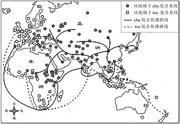 “茶”的两大发音系统在亚、非、欧三大洲分布示意图