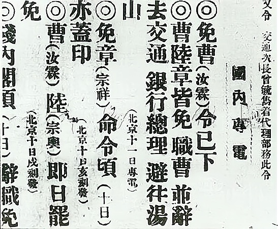 曹汝霖等人免职令