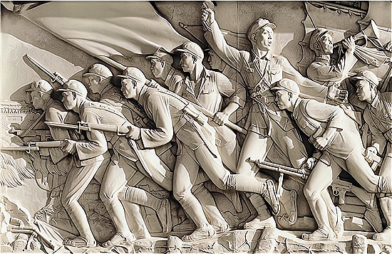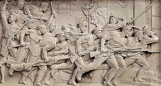 材料 在北京天安门广场的中央位置,立着人民英雄纪念碑,是为了纪念在人民解放战争和人民革命中牺牲的人民英雄。下图是纪念碑上的三幅浮雕。