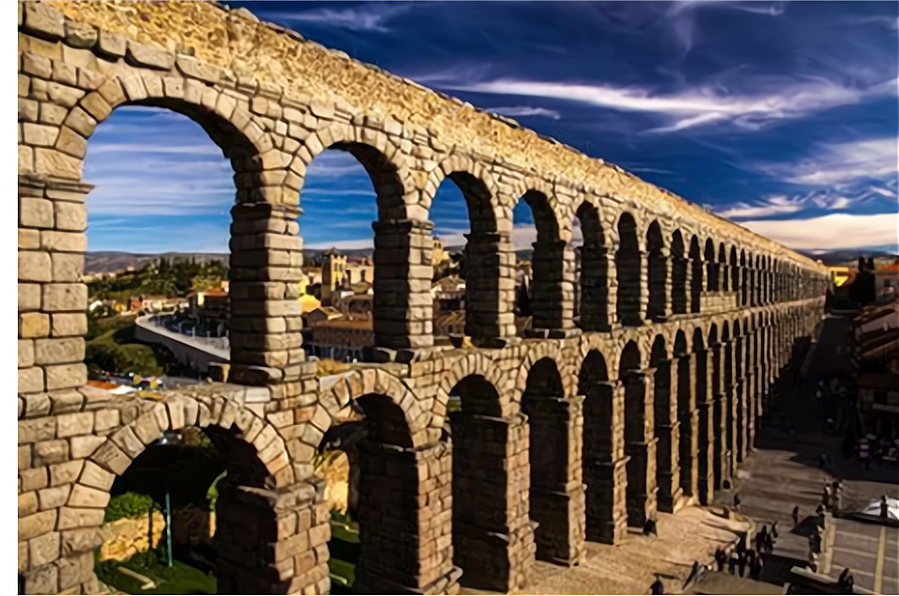 罗马城起于山丘之上,台伯河河床较低致使当地居民日常取水极其不便。帝国境内地势险要之处的水源无法满足军事需要,位于西班牙的陈旧供水系统也无法满足居民日常用水需求……从而修建了赛戈维亚古罗马高架引水桥,引水桥由2.04万块石块堆砌而成,共由166个圆拱构成,128根石柱支撑,长728米,高30.25米。引水桥巧妙地结合赛戈维亚的地势特点进行设计,将河水引向地势较高的城市区域。
