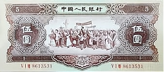正面图案采用解放汽车、国产飞机、拖拉机、水电站、天安门、 井冈山、工农像等,背面为国徽及汉、蒙、维、藏四种文字的银行名和面值。1955年3月1日正式发行。