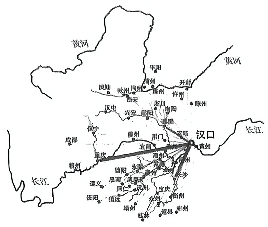 图1 1875—1895年的汉口子口税贸易范围(21年平均值,线条粗细表示贸易量大小)