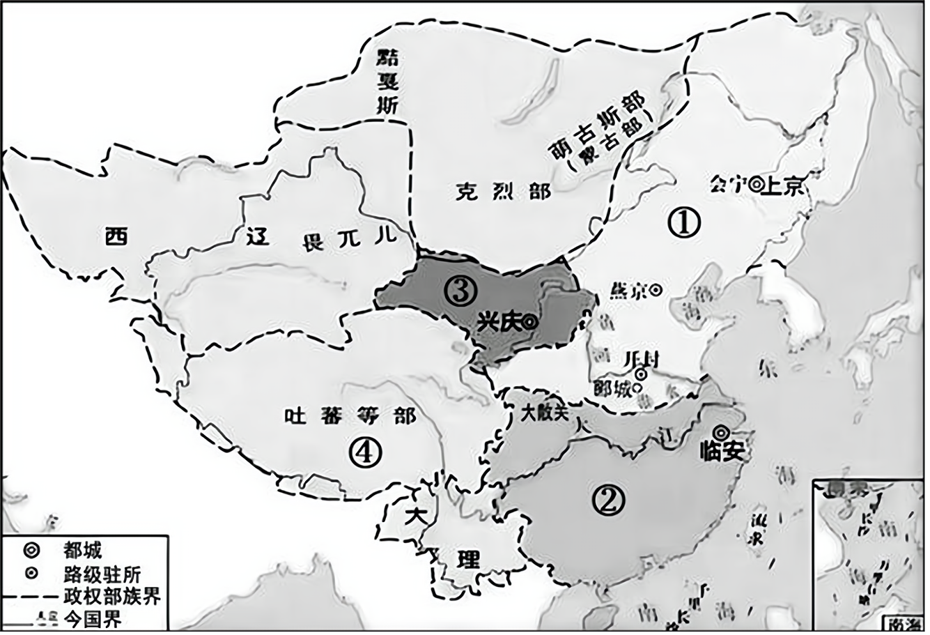 下图中①②③④代表的是1142年并存的政权,对它们之间关系的描述符合史实的是