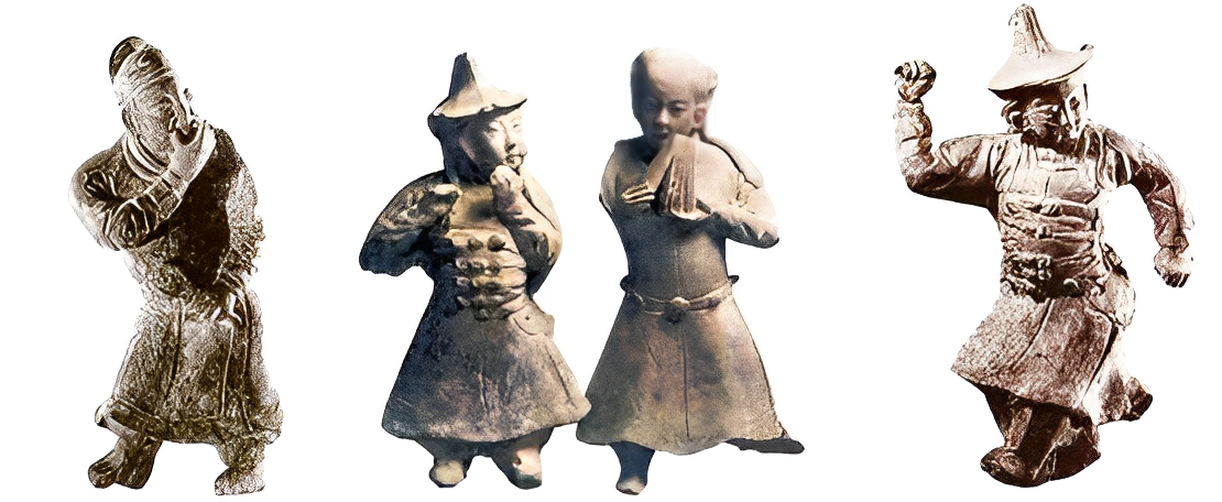 如上图为元墓出土的杂剧陶俑(吹口哨、吹笛、击节板、舞蹈)。