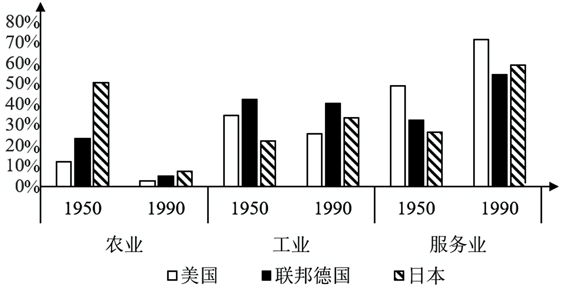 图2 二战后美国、联邦德国、日本就业人口分布变化