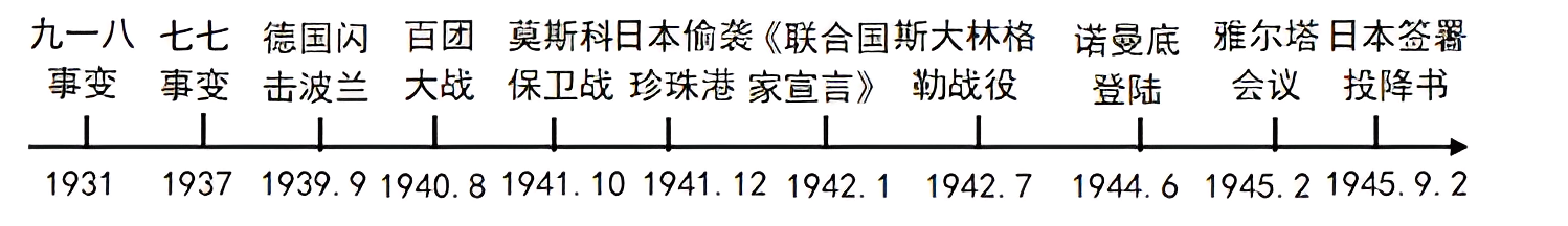 九一八事变、七七事变、百团大战、《联合国家宣言》、日本签署投降书。