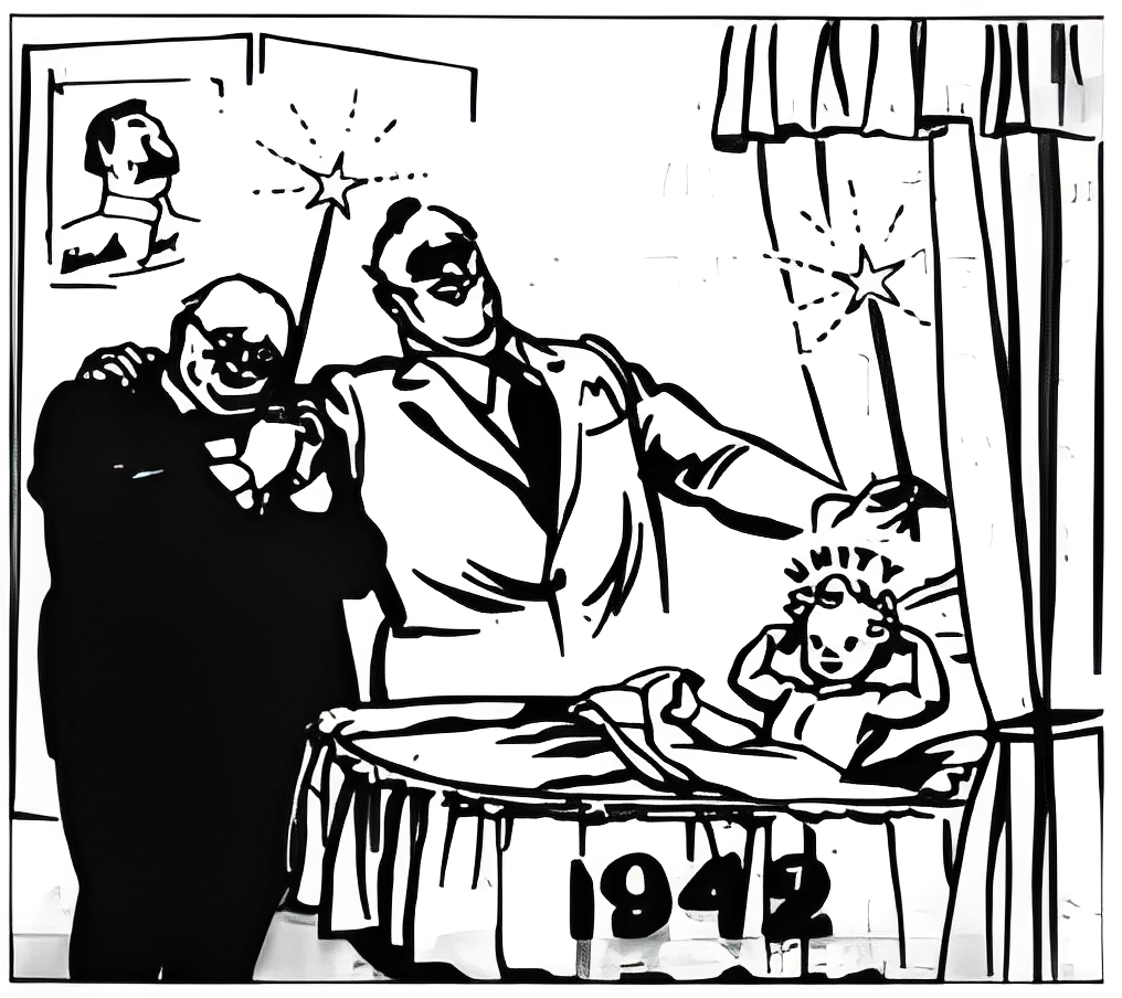 漫画发表于宣言签字前夕。画中,罗斯福和丘吉尔在庆祝一个1942年即将诞生的被称为联合(unity)的新生儿。墙上挂着斯大林等领导人的画像,画像上都露出满意的笑容。